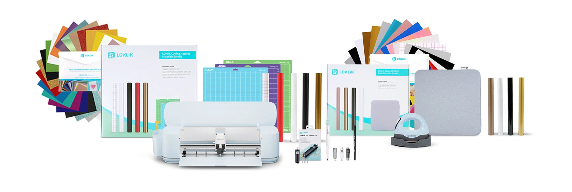 Starterpakketten U hoeft niet naar de juiste materialen te zoeken: de startpakketten bieden een selectie vinyl met warmteoverdracht, zelfklevend vinyl en transfertape. Je kunt meteen beginnen met je eerste projecten! Het startpakket voor de LOKLiK ImPress™ Mini 3 en LOKLiK iCraft™ zijn inbegrepen.Aanvullende materialen De permanent zelfklevende vinylmateriaalbundel heeft een selectie van 29 verschillende vinylkleuren, ideaal voor het maken van duurzame, duurzame stickers en labels op harde oppervlakken. Elk A4-vel heeft een sterke hechting en is gemakkelijk te snijden, waardoor het ideaal is voor maatwerk. De Heat Transfer Vinyl Material Bundle biedt een selectie van 27 verschillende vinylkleuren, perfect voor het personaliseren van T-shirts, draagtassen en meer. Elk A4-vel is gemakkelijk te knippen en aan te brengen, wat zorgt voor levendige, duurzame en opvallende ontwerpen.
