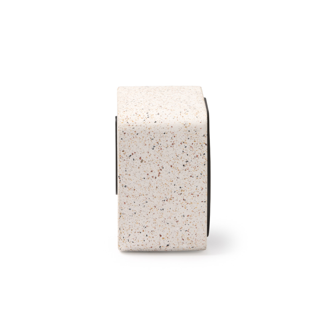 Draadloze luidspreker met behuizing gemaakt van gerecycled terrazzosteen en bamboe.