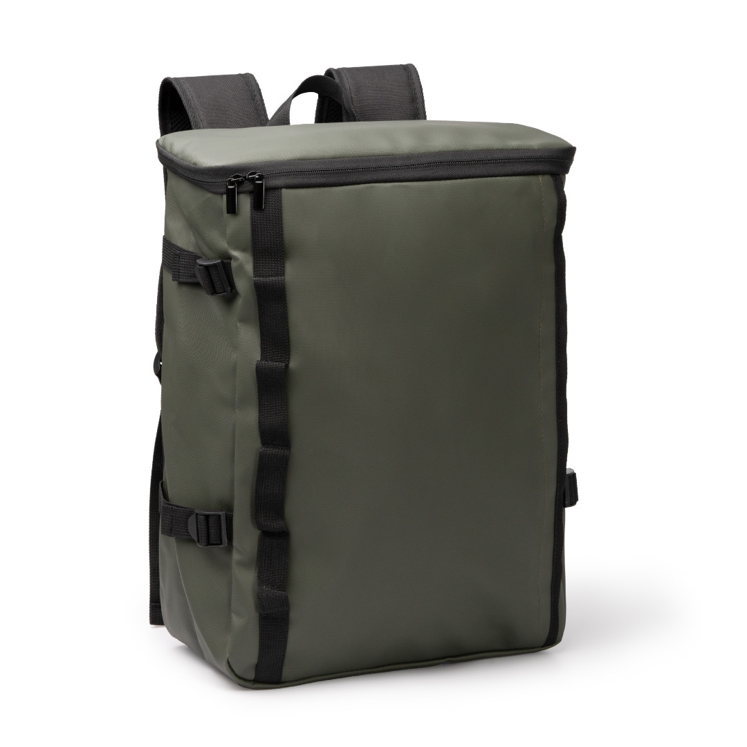 Rugzak gemaakt van PU-leer en 600D polyester met een groot, aan de bovenkant gevoerd hoofdvak, ritssluiting en een binnenvak met elastische verstelling voor een laptop tot 16''. Voorzien van een onzichtbaar buitenvak aan de voorzijde en zes bevestigingspunten aan de zijkant. De verstelbare zijriemen zorgen ervoor dat de rugzak kan worden aangepast aan de inhoud, en de trolleyband maakt hem een comfortabele en veelzijdige optie in gebruik. Gewatteerde rug- en schouderbanden.