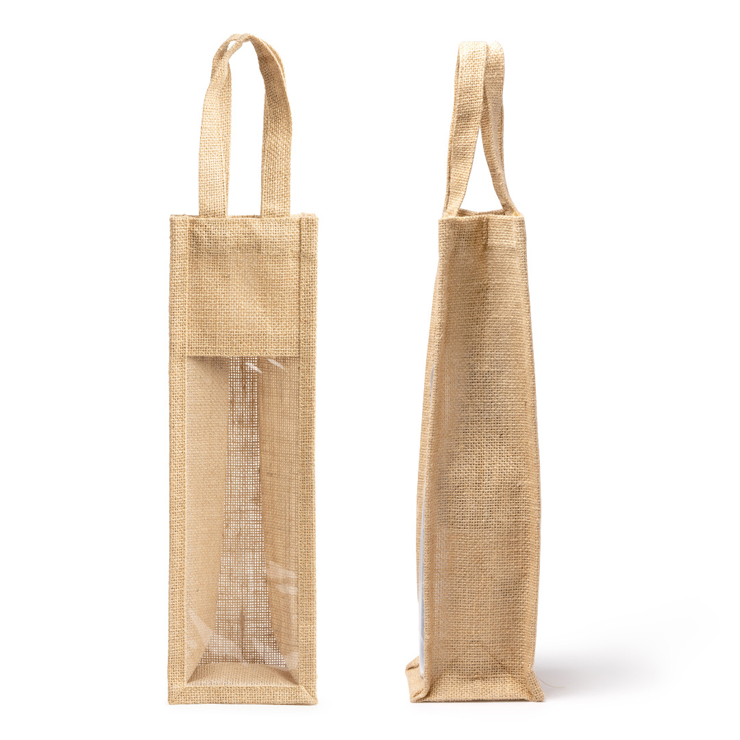 Gelamineerde jute tas met venster. Versterkte handgrepen. Perfect voor flessen.